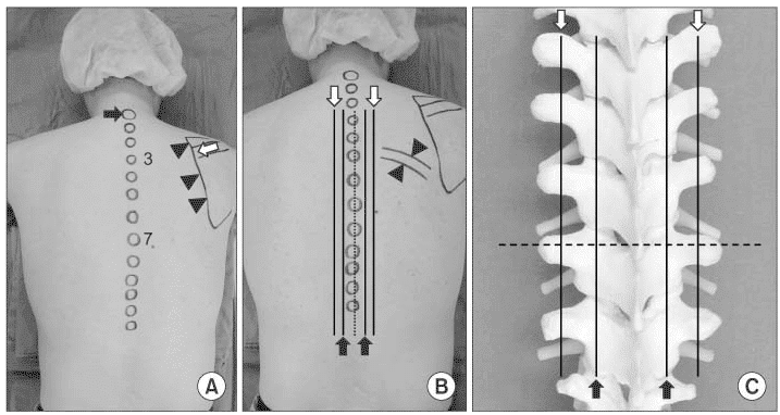 図6 体表からみる肩甲棘内側端とT3の位置(A参照)