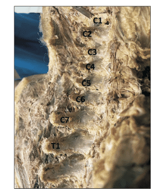 死体解剖の触診研究では、椎体で最も突出する棘突起は、C7が約49%、C6が約36%、C5が約10%、T1が約5%と大きな個体差がある¹⁾ことが報告されています(図2、図3)。