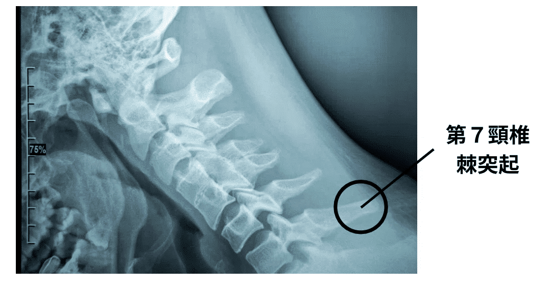 椎体で最も突出する棘突起は一般的に第7頚椎(C7)とされ、隆椎(Vertebra prominens:VP)とも呼ばれています(図1)。