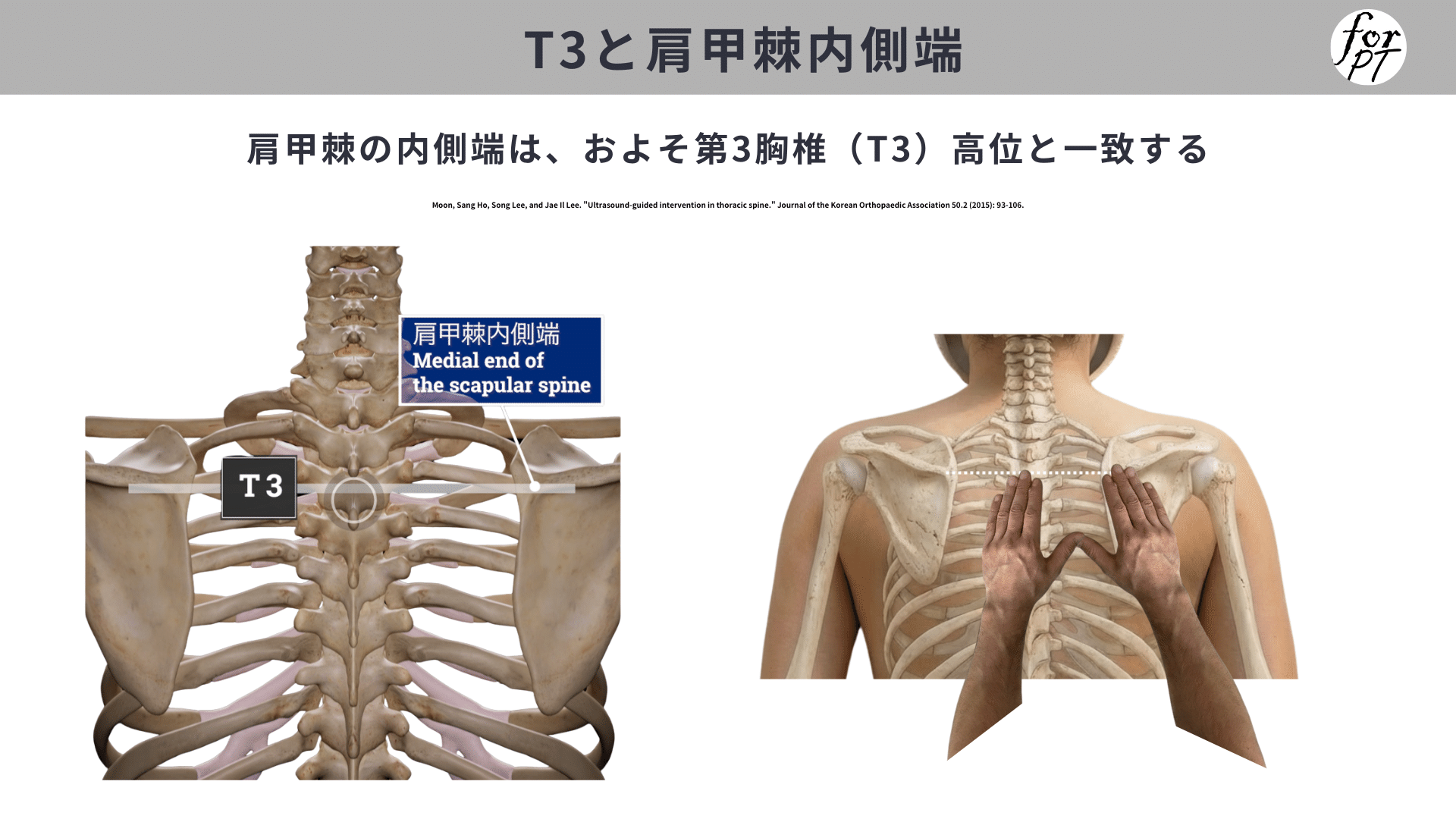 肩甲骨の内側端は、およそ第3胸椎(T3)高位と一致する³⁾とされます(図5、図6)。