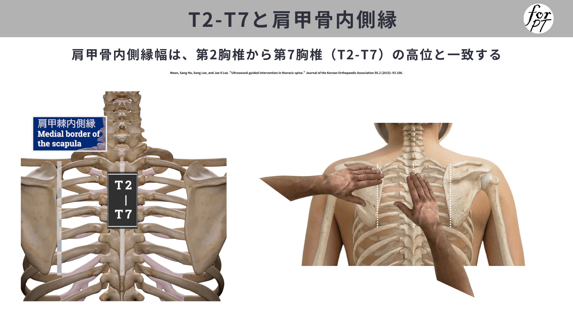 肩甲骨内側縁幅は、第2胸椎から第7胸椎(T2-T7)の高位と一致する³⁾とされています。