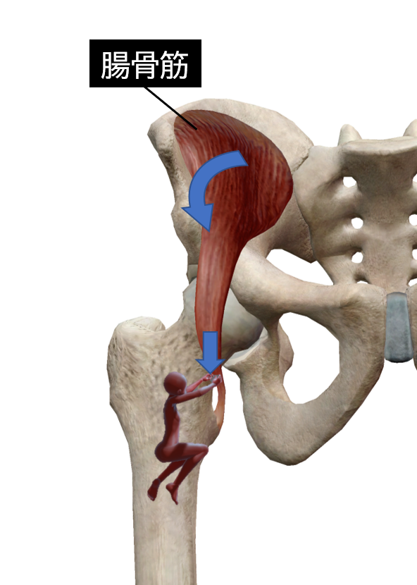 股関節が屈曲すると、大腿骨は後傾(後方回旋)し、相対的に同側の寛骨は前傾しています。