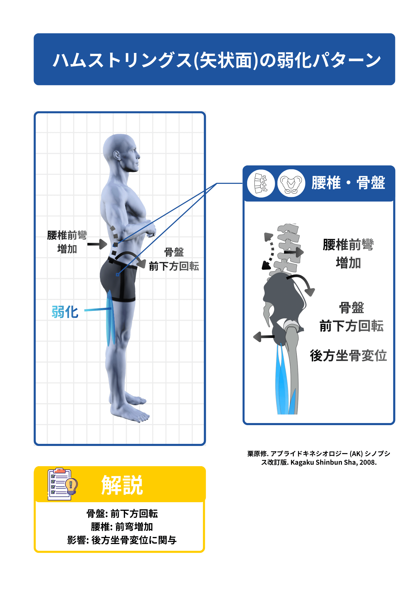 姿勢・筋膜 有料記事 膝関節足部姿勢分析 姿勢分析に役立つ筋弱化パターン②ー膝関節・足部ー 2026年1月8日 2026年1月8日 1分27秒 膝関節の筋弱化と変位 ハムストリングスの弱化(図1)は、骨盤を前下方へ回転(前傾)させ、腰椎前弯の増加と椎間関節の近接を招きます。これは後方坐骨サブラクセーションにも関与します。 図1 ハムストリングスの弱化 このコンテンツを閲覧するにはログインが必要です。 ログインは【こちら】. 新規会員登録は【こちら】