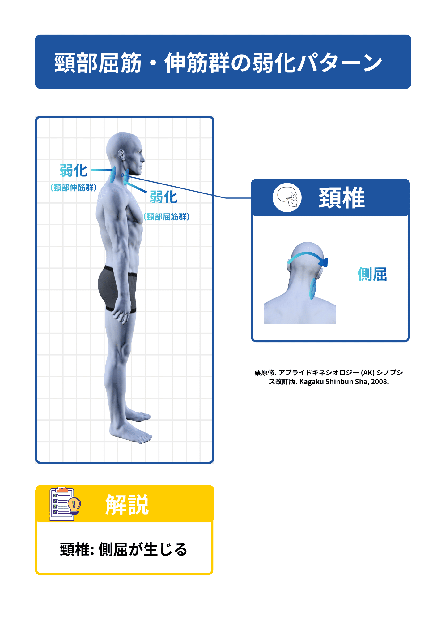 姿勢・筋膜 有料記事 体幹姿勢分析頭頸部 姿勢分析に役立つ筋弱化パターン③ー頭頸部・体幹・上肢・肩甲帯ー 2026年1月11日 2026年1月11日 2分46秒 頭頸部の筋弱化と変位 頸部の筋バランスは、頭位の偏位として現れます。 頸部屈筋および伸筋群の弱化(図1)では、頸椎に側屈が生じます。 図1 頸部屈筋および伸筋群の弱化 このコンテンツを閲覧するにはログインが必要です。 ログインは【こちら】. 新規会員登録は【こちら】