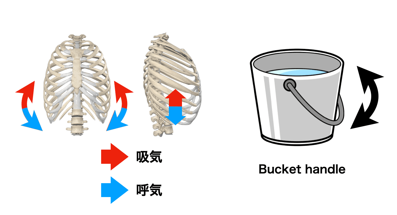 肋骨は、肋骨全体が前方回旋し、肋骨体遠位側が前下方へ移動します。