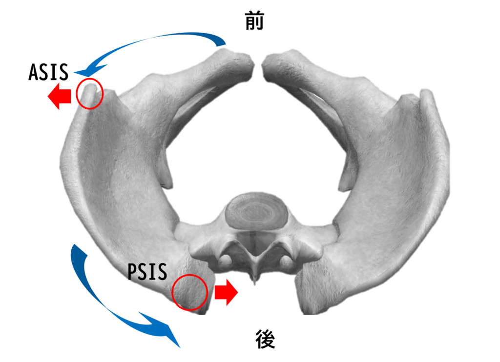 水平面上で、寛骨が内方へ回旋する運動をいいます。この時、ASIS(上前腸骨棘)は内側へ、PSIS(上後腸骨棘)は外側へ偏位します。
