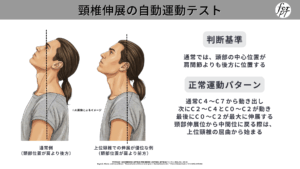 頸部伸展位から中間位に戻る際の異常パターンとして、胸鎖乳突筋による下位頸椎の前方移動や、頸部深層筋群の筋力低下に伴って上位頸椎が最後に屈曲することがあります。