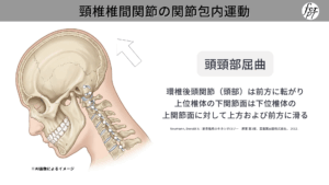 頭頸部屈曲時の関節包内運動では、環椎後頭関節(頭部)前方に転がり、上位椎体の下関節面は下位椎体の上関節面に対して上方および前方に滑ります(図13)。