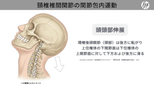 頭頸部伸展時の関節包内運動では、環椎後頭関節(頭部)後方に転がり、上位椎体の下関節面は下位椎体の上関節面に対して、下方および後方に滑ります(図14)。