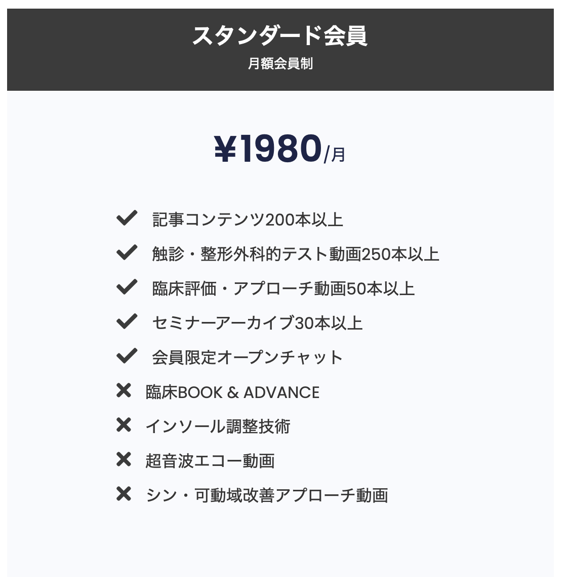 ※臨床BOOK & ADVANCE、インソール調整技術、超音波エコー動画、シン・可動域改善アプローチ動画は、スタンダード会員のみが移行できるプレミアムプランで提供しています。